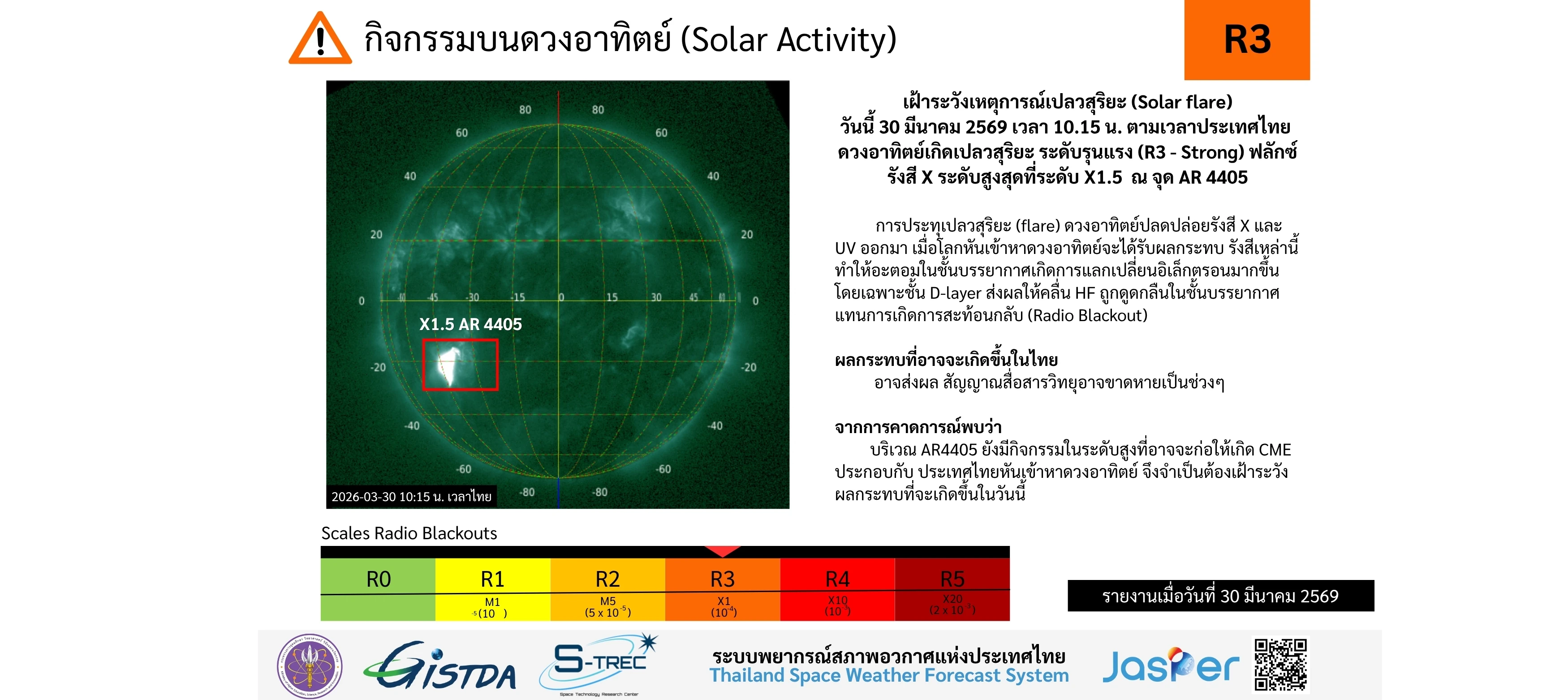 02/04/2026 04:45 LT (UTC+7)🌞 กิจกรรมบนดวงอาทิตย์ (Solar Activity) ระดับกิจกรรมเปลวสุริยะ: R0 (Eruptive) – มีการปะทุ แต่ไม่ก่อให้เกิด Radio Blackout รายละเอียด: เกิดเหตุการณ์เปลวสุริยะ (Solar Flare) ระดับ C8.1 จากบริเวณ AR 4409 เวลาเกิดเหตุการณ์: 02/03/2026 เวลา 02:58 น. (เวลาไทย) แนวโน้ม: คาดว่ากิจกรรมบนดวงอาทิตย์จะยังคงอยู่ในระดับสงบในวันถัดไป 🌍 สนามแม่เหล็กโลก (Geomagnetic Field) ระดับพายุสนามแม่เหล็กโลก: G1 (Minor Storm) การคาดการณ์: คาดว่าในวันพรุ่งนี้สนามแม่เหล็กโลกจะอ่อนกำลังลงสู่ระดับ G0 (Quiet) ⚛️ เหตุการณ์โปรตอน (Proton Event) ระดับฟลักซ์โปรตอน: S0 (Quiet) สถานะปัจจุบัน: ค่าฟลักซ์โปรตอนคงที่ ไม่ก่อให้เกิดพายุการแผ่รังสีจากดวงอาทิตย์ (Solar Radiation Storm) การคาดการณ์: คาดว่าจะยังคงอยู่ในระดับ S0